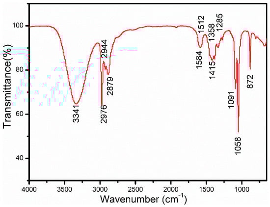 The FTIR spectra of the ZnO sol were measured to explore the chemical changes of the sol–gel process. As depicted in Figure 3, during the process, the vibration at 3341 cm−1 is ascribable to the O–H stretching vibration of H2O, which is formed through polycondensation. The peak at 2976 cm−1 is attributable to the N–H group and the small absorption peaks at 2944 cm−1 and 2879 cm−1 are attributable to the C–H asymmetric and symmetrical vibrations of the DEA, respectively. Furthermore, the peaks at 1584 cm−1 and 1415 cm−1 are attributable to the C=O asymmetric and symmetrical stretching vibrations. It also indicated that the DEA and the zinc acetate formed complex compounds in the sol which promote the synthesis of a clear and homogeneous solution. Peaks at 1058 cm−1 and 1091 cm−1 are ascribable to the C–N stretching of the DEA. There are two small vibrations at 1358 cm−1 and 1285 cm−1 due to the –CH2–O–Zn stretching vibration, which is synthesized by PEG1000 and zinc oligomers. Moreover, the peak at 872 cm−1 is the result of the C–H out-of-plane bending vibration, which indicates that the PEG1000 and zinc oligomers formed a network structure through their strong interaction. Therefore, from the chemical changes during the sol–gel process, it may be deduced that zinc acetate is firstly complexed with DEA, zinc oligomers are then produced, and PEG1000 finally interacts with the zinc oligomers to form a network structure. The pore formation mechanism of ZnO porous thin films is discussed in detail as follows.