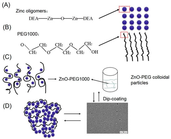 It has been suggested that PEG1000 affects the zinc acetate dihydrate system by hydration and through its interactions with ZnO particles, including chemical and hydrogen bonding [,]. Moreover, based on the schematic model for the formation of TiO2 films [,], the schematic model for the formation of ZnO porous thin films is shown in Figure 4. As demonstrated in Figure 4A, DEA complexed with [CH3COOZn]+ and those complex compounds can prevent the fast hydrolysis of sol particles. During the process, zinc oligomers can be formed. Figure 4B shows that the PEG1000 molecule is a long zigzag chain structure. The structures consisting of –O– and –CH2–CH2– are hydrophilic and hydrophobic, respectively. In Figure 4C, when PEG1000 was added to the sol, it initially interacted chemically with the sol particles to produce ZnO–PEG1000 colloidal particles. Meanwhile, the sol began to form pore structures due to the phase separation effect []. Those particles then formed ring-like network structures because of the strong interaction between the PEG1000 and the zinc oligomers under appropriate conditions. As shown in Figure 4D, after the dip-coating process, the final pores of the thin films can be produced by the volatilization, decomposition, and combustion of the ethanol solvent and the PEG1000 molecules. SEM images demonstrated this structure. As shown in the SEM images, ZnO porous thin films were successfully fabricated with PEG1000 as a polymeric porogen. Moreover, it can be clearly seen that the pores are distributed uniformly in the film in a short order.