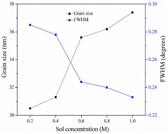 Variation of the grain size and the full width at half maximum intensity (FWHM) of the ZnO films according to the sol concentration.