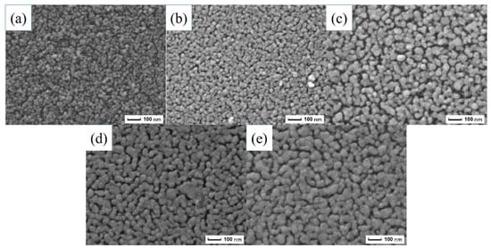 Scanning electron microscopy (SEM) images of the ZnO films at different sol concentrations: (a) 0.2 M, (b) 0.4 M, (c) 0.6 M, (d) 0.8 M, and (e) 1.0 M.