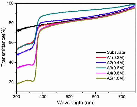 To further explore the effects of sol concentration on the optical transmittance of ZnO porous thin films, the optical transmittance and the band gap (Eg) were discussed. The optical transmittance of ZnO porous thin films fabricated at different sol concentrations is shown in Figure 8. All of the films are highly transparent throughout the visible range, with transmittance values of more than 75%. As can be seen from the spectra, the films coated with 0.4 M and 0.6 M sol concentrations have higher transmittance values than the alumina transparent ceramic substrates. Specifically, the highest transmittance of the ZnO porous thin films increased by approximately 8.5% compared with the substrates in the visible range. Therefore, these films can be treated as antireflection coatings [,,]. However, the films fabricated with 0.2 M, 0.8 M, and 1.0 M sol concentrations showed lower transmittance values than the substrates. Surface morphology has a significant influence on optical properties. This change in transmittance might be because of the appearance of the micropore structure in the porous films, as discussed earlier when considering the SEM images. The decrease in the transmittance is also attributable to optical scattering caused by some cracks and the increased grain size in the porous films.