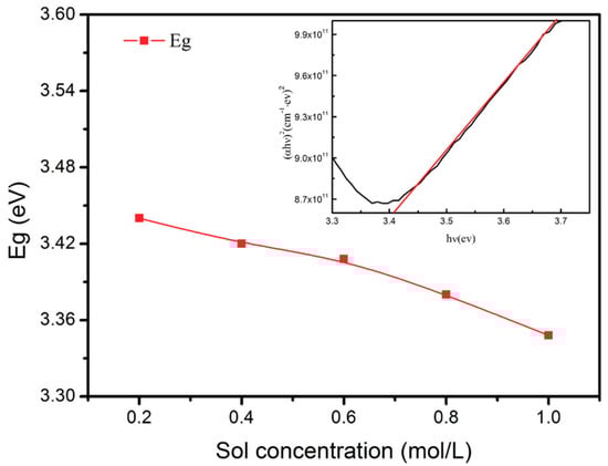In the optical transmittance spectra, the transmittance increased sharply for all of the samples near the ultraviolet region. This phenomenon can be explained by the intrinsic band gap of ZnO [,,]. Figure 9 shows the variety of optical band gaps of the ZnO films at different sol concentrations. The formula for the optical absorption edge is as follows []: