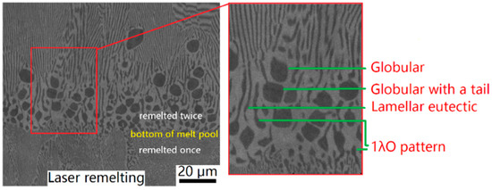 Figure 1 shows the anomalous eutectic morphologies observed in the laser remelting process. The dark phase is α-Ni, and the light phase is β-Ni3Sn. The α-Ni morphologies can be summarized into four types: globular, globular with a tail, lamellar eutectic, and 1λO pattern, as shown in Figure 1. Compared to eutectic colony solidified from undercooled melt, the anomalous eutectic morphologies during laser remelting process were sandwiched between lamellar eutectic at the bottom of the melt pool after laser remelting Ni-30wt.%Sn powders twice, as seen in Figure 1. The microstructure evolution at the bottom of melt pool can be divided into two processes: one is the lamellar to anomalous transition (LAT), which indicates the anomalous growth from the lamellar eutectic substrate; the other is the anomalous to lamellar transition (ALT), after which, the final microstructure becomes coarser lamellar eutectic. The LAT process is beyond the expected epitaxial growth from the lamellar eutectic substrate. This is contrary to epitaxial dendrite growth from the dendritic substrate. The ALT process is also remarkable in that, as the solidification process continues, lamellar eutectic growth is more competitive than anomalous eutectic.