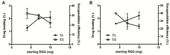 As shown in Figure 1, the encapsulation of RSG in nanoparticles obtained by nanoprecipitation using ACN (A) or acetone (B) as solvent present a similar trend, reaching a drug loading of around 2% in both cases. For ACN nanoparticles, the drug loading seems to level off at 2% already with a starting amount RSG of 7 mg, which corresponds to encapsulation efficiencies of 20–30%. In the case of acetone, the drug loading seems to increase with increasing starting amount, reaching slightly levels above 2% with a starting amount of RSG of 10 mg. These relatively low drug loadings achieved are nevertheless in agreement with literature as they strongly depend on drug–polymer interactions [,,,].