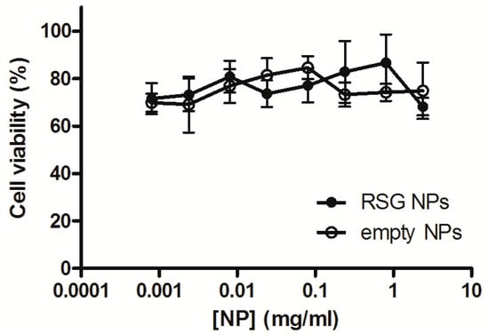 In the context of the atherosclerotic disease, plaque macrophages represent a relevant target of anti-inflammatory drugs as they play a key role in many processes involved in the progression of the disease. Among others, they can undergo apoptosis and therefore contribute to the plaque necrotic core, are involved in the activation of immune responses, promote the platelet aggregation on the inflammation site, and produce metalloproteinases which are responsible for the thinning of the fibrous cap. Therefore, RAW264.7 murine macrophages have been chosen to test nanoparticles efficiency in reducing the inflammation. Preliminarily, it is pivotal to assess the nanoparticles’ safety towards the chosen cell line. An MTT test was performed which evaluated the mitochondrial activity of treated cells. Cells were incubated 24 h with RSG nanoparticles and the corresponding empty nanoparticles at different concentrations. As depicted in Figure 3, no significant difference in cell viability was found among all concentrations tested. Both formulations grant a cell viability of around 70% for concentrations between 8 µg/mL to 2.4 mg/mL. These nanoparticles can be considered safe towards RAW264.7 cells even at relatively high concentrations and have therefore been tested further for their anti-inflammatory activity.