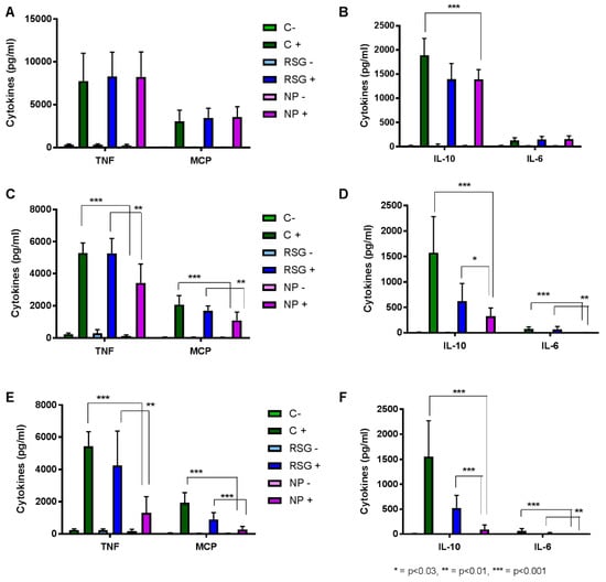 TNF, MCP (A,C,E), IL-10, and IL-6 (B,D,F) concentrations in supernatants of RAW264.7 cells after 24 h exposure to cell medium (C-), 0.1 µg/mL LPS (C+), free RSG (RSG-), free RSG and LPS (RSG+), NPs (NP-), NPs and LPS (NP+). Rosiglitazone and corresponding NP concentrations are 7.6 µM (A,B), 59 µM (C,D), 227 µM (E,F).