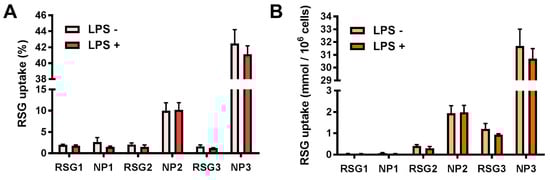 To explain the mechanism of the improved nanoparticles’ efficiency in reducing the inflammation as compared to the free molecule, an uptake study has been performed for the evaluation of intracellular levels of RSG in both cases. Radioactive RSG has been used as a tracer and the same protocol as for the cytokines detection has been applied. As Figure 5 shows, no internalization difference between free RSG and NPs can be seen for the smallest RSG concentration. However, the difference in the internalization increases as the RSG concentration does, up to 40% NP RSG uptake as compared to 2% for the free molecule, when the highest concentration was tested. This corresponds to 30 mmol of RSG delivered per million of cells (Figure 5B). The increased RSG uptake in the case of NPs correlates with their superior efficiency in reducing the inflammation, due to the greater amount of molecule delivered inside the cells at its site of action. Furthermore, the presence or absence of LPS does not affect the cell’s capability to take up nanoparticles.