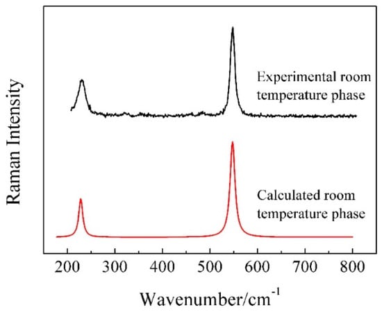 In Figure 3, there are two well defined peaks in the calculated spectrum, which locates at 227.6 and 547.4 cm−1. The calculation results show that the band at 227.6 cm−1 relates to the shearing vibrations of AlVI-Fnb (Fnb represents non-bridging fluorine) while the band at 547.4 cm−1 corresponds to the symmetric stretching vibrations of AlVI-Fnb. According to the group theory analysis, the vibrational modes are distributed among the following irreducible representations: 4A2u + 16Eu + 2B2u + 2A1g + 6Eg + 1B2g + 2A1u + 2A2g + 1B1g, where only A1g, Eg, B2g and B1g are Raman-active modes based on the selection rules. Similarly, two peaks were observed at 228 and 547 cm−1 in the wavenumber range of 200–600 cm−1 of the experimental spectrum at room temperature. Comparing with the calculated results of the room temperature KAlF4 crystal, the band at 228 cm−1 is believed to be due to the shearing vibrations of AlVI-Fnb, while the band at 547 cm−1 results from the symmetric stretching vibrations of AlVI-Fnb. Overall, the simulated results were in good agreement with the experimental spectra for the main vibration peaks. Therefore, it is feasible to apply DFT to calculate Raman spectra of fluoroaluminate systems [26,27]. The major vibration modes of the room temperature phase of KAlF4 are listed in Table 1. And all of the calculated Raman modes of the room temperature phase of KAlF4 are shown in Table S1 (in Supplementary Materials).