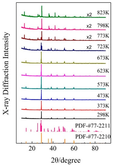 The temperature dependent X-ray diffraction spectra of the synthesized KAlF4 compound were recorded while the sample was heated from room temperature to 823 K. The sample was heated at about 10 K/min under an argon atmosphere and held at each temperature point for five minutes prior to measurement to ensure that the sample reached the designated temperature. As shown in Figure 4, the sample maintained in its room temperature tetragonal structure until 673 K and then transformed to the high temperature phase as the sample temperature was further raised from 673 to 723 K. The high temperature phase of KAlF4 is characterized by a monoclinic structure, belonging to the P21/m space group, with its unit cell dimensions a = 6.542 Å, b = 7.195 Å, c = 7.177 Å, α = 90°, β = 108.478°, γ = 90°, V = 320.415 Å3, which is similar to the structure in the literature [7].