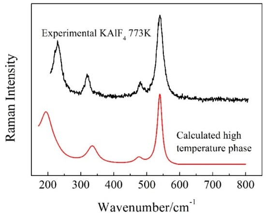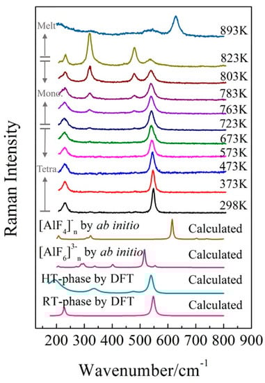 Figure 7 presents the Raman spectra of the KAlF4 crystal recorded when the sample was heated (at a heating rate of 10 K/min) from room temperature to 823 K and at a heating rate of 5 K/min afterwards. The high temperature spectra were recorded 5 min after the sample reached the target temperature. Figure 7 includes the calculated Raman spectrum of [AlF6]3−n clusters (by ab initio method) which refers to our previous work [28]. As the sample temperature increased, the Raman band at 547 cm−1 shows a clear evidence of band broadening and redshifts in wavenumber.