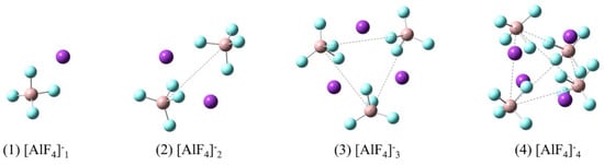 According to the literatures [29,30], [AlF4]− is the main species in molten KAlF4. Figure 9 illustrates a series of possible [AlF4]−n model clusters presented in molten KAlF4. After being optimized for geometry configuration, these model clusters were used for a quantum chemistry ab initio method to calculate the Raman spectra. The characteristic vibrational wavenumber of the Al-F symmetric stretching vibrational modes of the [AlF4]−n clusters were then estimated accordingly.