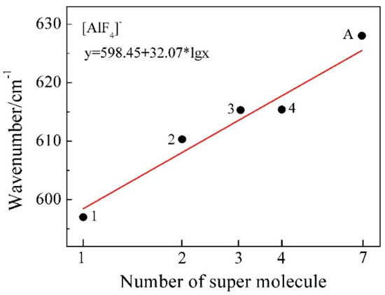 The restricted Hartree-Fock calculation method using a 6-31G (d) [31,32] basis set and was applied for geometry optimization and simulation of Raman vibrational modes of possible model clusters in the melt. When the calculated Raman spectra are compared with the experimental results, corrections are often needed for the intensity and frequency due to the effect of experimental temperature and the laser wavelength [33]. The wavenumbers of the calculated Raman spectra in Figure 10 have been corrected using a scaling factor of 0.90 [34] to better represent the experimental Raman spectrum. The characteristic wavenumber of Al-F symmetric stretching vibrational modes was further estimated from Figure 10 and compared with the experimental and reported values in Table 4. The local structure environment of a crystal is believed to have brought an impact on the structure in of the melt when it is melted. Therefore it was assumed that there are six [AlF4]− tetrahedra in the neighbor of an isolated [AlF4]− tetrahedron in the melt according to the crystal KAlF4 structure in KAlF4. In Figure 11, the characteristic wavenumber of the symmetric stretching vibrational modes of a particular model cluster was plotted in a log scale as a liner function of the number of molecules in the [AlF4]−n cluster. As the number of molecules in the clusters increased, the characteristic wavenumber of the Al-F symmetric stretching vibrational mode of [AlF4]−n appeared to increase. The symmetric stretching vibrational wavenumber of the model cluster with seven molecules of [AlF4]− was therefore estimated to be 625.6 cm−1, which was in good agreement with the values observed in the experiment and reported in the literature [15,35,36,37].