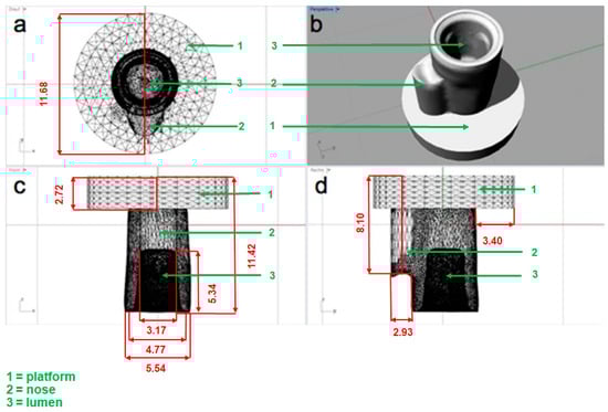 View of the design using the Dental-Designer software (3 shape, Copenhagen, Denmark) with above (a), transverse (b), and sidelong (c,d) views of the crown. All sizes are in mm.