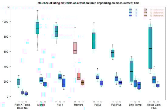 At T1, the required retention force was considerably higher than at T2 or T3 (Table 6). In general, the retention force was continuously reduced from T1 to T3. The median retention force at T1 (independent of luting material or storage condition) was 619.20 N, with an interquartile range (IQR) of 410.40–852.20 N. At T2, the median force decreased to 226.70 N (IQR 190.00–259.20 N); therefore, the lowest force, corresponding to 162.80 N (IQR 132.30–198.60 N), was reached at T3 (Figure 2).