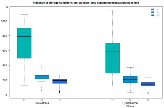At each retention measurement time-point (T1, T2, and T3), the retention force after storage under hydrostress was conspicuously higher than after storage under hydrothermal stress (Figure 3, Table 10, Table 11 and Table 12).