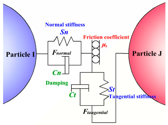 where the tangential contact force (Ft) is limited by Coulomb’s law of friction and meets the relationship in a system without sliding [18,22]. Therefore, the normal and tangential force based on the normal and tangential overlap can be represented as and , respectively. The normal and tangential damping forces are described in Tsuji’s research [24] and can be expressed as and . Therefore, the total force is given by
