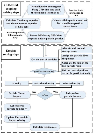 In the current study, erosion prediction involved the calculation of liquid–particle, particle-particle, and particle-wall interactions, which were completed via CFD coupled with DEM. The CFD code ANSYS FLUENT [38] was employed to model the continuous phase flow. Meanwhile, discrete particle motion modeling was accomplished using the DEM code EDEM [39] as shown in Figure 3. The governing equations (Equation (28a,b)) were discretized in a finite volume form and then, the discretized equations were solved using a semi-implicit method for pressure linked equations (SIMPLE), which is described by Ferziger [40] in detail. The explicit time integration method was used to calculate the motion of the particles. When a stable fluid region was obtained, the drag and contract forces between the fluid and particle were calculated using the DEM time step. Subsequently, new particle positions were transferred to the coupling module between CFD and DEM. The flow field was updated until the results satisfied the accuracy requirement. Two calculations were performed independently but were coupled at regular intervals, commonly with multiple DEM time steps for a single CFD time step.