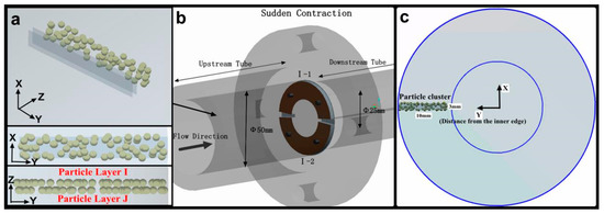 According to Habib’s research [32,33], particles move toward the centerline of the pipe as they approach the sudden contraction section. As shown in Figure 2b, the movement of two particles can be treated as a meeting problem in the Z direction as well as a catching-up problem in the Y direction after the rebound of particle i. Therefore, the release time (tr) should meet the following relationship in order to satisfy the time adaptive condition of particle collision.