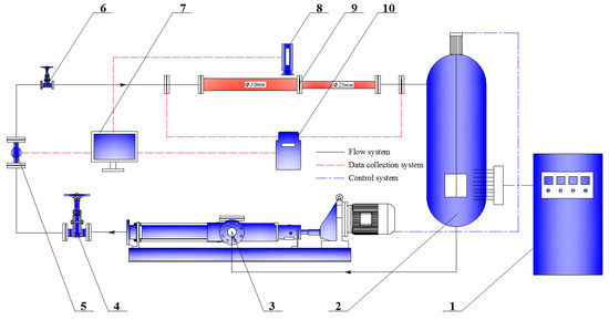 A full-scale pipe flow experiment was used to study particle clusters during erosion and to verify the simulation results. As shown in Figure 5, the experimental loop mainly comprised a contraction section, a screw pump (with a flow range of 5–60 m3/h), an electric heating agitator, a temperature and pressure sensor, a magnetic flowmeter (8712HR, Emerson, Rosemount. Co., Boulder, CO, USA), four gate values, a control cabinet, a computer, and connecting pipes. After the test fluid containing the particles was mixed, stirring and electric heating units were turned on until the temperature reached the required value and then the pump was turned on. The gate valve in the test pipe was opened when the flow reached stability and the related data, including a particle motion image, flow pressure, and temperature were recorded.