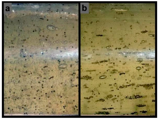 Distribution of particles in different fluids, (a) dispersed particles in the base fluid; (b) particle clusters in the crosslinking fluid.
