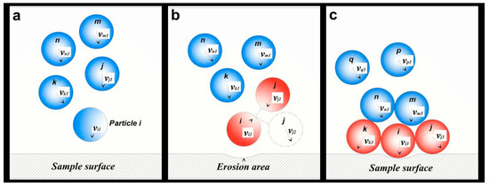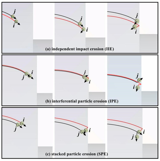 As shown in Figure 7b, most of the particles formed many particle clusters and gathered together across the upstream section. When the particle cluster impacted the wall, the particle-wall contact process may involve three steps: Initial contact between the front particle and the wall, rebound of the front particle, and collision interference between particles. The initial contact occurred between particle i and the metal surface (Figure 9a). If particles were too close, particle j in the cluster would collide with rebounding particle i (Figure 9b). Afterward, numerous subsequent particles may collide with each other and even form an unstable accumulation layer (Figure 9c).