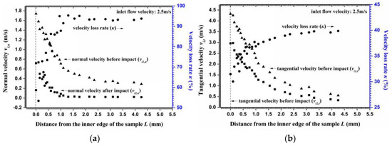 Particle Layer I, which was in front of Particle Layer J, represented particles that initially impacted the wall and were not subject to particle collisions. By contrast, the particles in Layer J may suffer from particle-particle collision interference near the wall. In each particle layer, particles were randomly positioned, thus satisfying the multiple possibilities of particles impacting the wall. Therefore, the number of particles mentioned in Table 3 is an average value and may change with different particle-producing positions. Meanwhile, a particle-moving calculation at each velocity was repeated 10 times to count the particle impact parameters on different radial walls because not all surfaces in the calculation process were impacted. Moreover, the inducing wall was considered to be under a no-slip condition, where ur|r = ux|r = 0 = 0 and әur/әx = 0 and a fully developed incompressible flow was considered at the velocity inlet and exit sections.