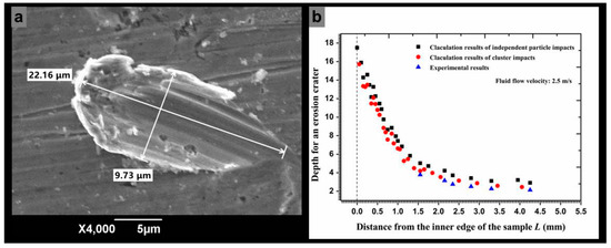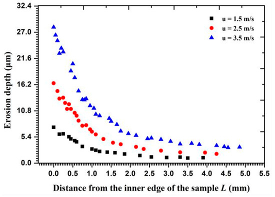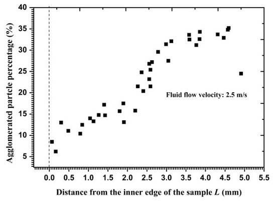 Figure 7 shows the particle distribution in the upstream pipe at a flow velocity of 2.5 m/s. Most of the particles were uniformly suspended in the base fluid (Figure 7a), resulting in an independent impact erosion (IIE) of the particles on the reducing wall. However, in the crosslinking fluid (Figure 7b), numerous particles collected into clusters, possibly leading to cluster impact erosion. Measurements of profiles of the erosive surface at the same flow velocity in the base fluid and crosslinking fluid are shown in Figure 8. The results show notably different erosion depths on the inner edge surface and the erosion difference gradually decreased along the radial direction. The maximum differences in erosion depth were 18.37, 11.96, and 8.43 μm, at the flow velocities of 1.5, 2.5, and 3.5 m/s, respectively. By ignoring the effects of metal corrosion, fatigue damage, and surface hardening, we identified that the critical cause of the erosion difference was particle collision interference, which diminished the impact energy of a fraction of the particles on the wall. As shown by the measurement results, the effect of particle interference was magnified by more particle impacts on the inner edge of the sample, whereas extremely small effects were observed in areas that were rarely impacted by particles (for a detailed description of the division of the erosion area on the reducing wall, we refer the reader to our previous work [45]).