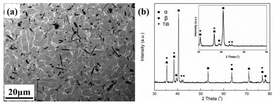 Titanium alloy reinforced with fibers or particles, also known as titanium matrix composites (TMCs) are commonly used in aerospace and marine industries that require their high specific strength and good corrosion resistance [1,2,3]. Generally, TiC, SiC and TiB are often used as reinforcing phases in titanium alloys, and they indeed improved the performance of titanium alloys to some extent [2,4]. In particular, the titanium boride (TiB) whisker is an effective reinforcement for titanium alloys, since the ceramic TiB phase has a high strength and an excellent thermal stability. Previous studies have indicated that the mechanical performances of titanium alloy are significantly enhanced with the addition of TiB whiskers [5,6].