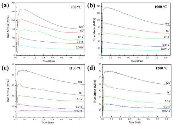 True stress-true strain curves of the UF-TiB/Ti-6Al-4V composites after being compensated for the influence of local overheating and friction: (a) 900 °C, (b) 1000 °C, (c) 1100 °C and (d) 1200 °C.