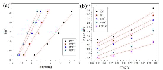 (a) Arrhenius plot of lnε versus ln(sinh(ασ)); (b) the Arrhenius plot of ln(sinh(ασ)) versus 1/T.