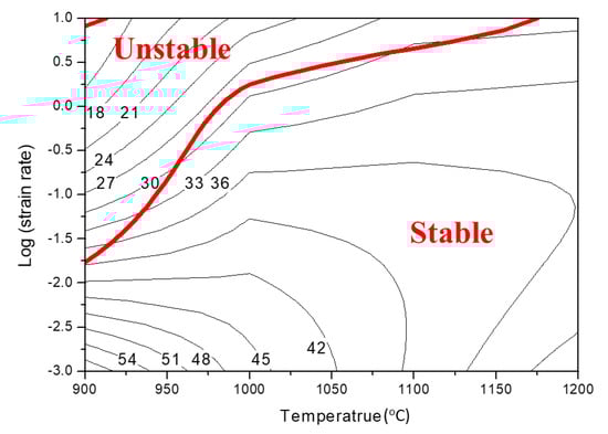 The power dissipation map was composed of various η values at different deformation temperatures and strain rates. Based on the extremum principle of irreversible thermodynamics, the instability criterion that was applied to the large plastic flow was given by Equation (6) [25].