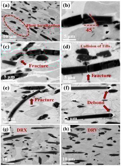 Microstructures of the UF-TiB/Ti-6Al-4V composite deformed at different conditions: (a) 900 °C/10 s−1, (b,c) 900 °C/1 s−1, (d,e) 1000 °C/10 s−1, (f) 1100 °C/10 s−1, (g) 900 °C/0.001 s−1, (h) 1100 °C/0.001 s−1.
