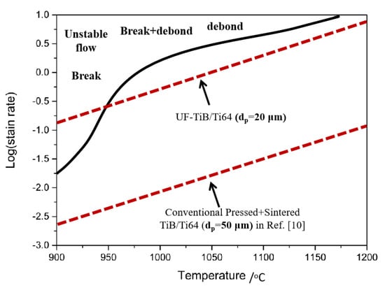 where G, ν, Ω and δDB represent the shear modulus, the Poisson rate, the atomic volume and the product of the grain boundary self-diffusion coefficient and the interface width, respectively, p and fv are the length and volume fraction of the TiB whiskers, and kB represents the Boltzmann constant. The parameters used to calculate the εc were given as follows [10]: ν = 0.27, fv = 0.15, k = 1.38 × 10−23 J K−1. p was the largest length of the whisker (~16 μm). G, Ω and δDc were 4.36 × [1 − (T − 300) × 6.2 × 10−4] × 1010 Pa, 1.76 × 10−2 nm3, and 8.6 × 10−10 exp(−150 kJ mol−1/RT) m2s−1 for the α titanium and 2.05 × [1 − (T − 300) × 2.58 × 10−4] × 1010 Pa, 1.81 × 10−2 nm3, and 1.9 × 10−8 exp(−153 kJ mol−1/RT) m2s−1 for the β titanium, respectively. Equation (10) relies heavily on the distribution and the size of the TiB whiskers. Considering that the distribution of the enhancement phase in the matrix was uniform, it was then applied to the calculation of the largest size of the TiB whisker. Figure 8 shows the critical strain rates at various temperatures for p = 16 μm of the UF-TiB/Ti-6Al-4V composite calculated using Equation (10). If the applied strain rate exceeded εc, the composite would undergo fracture. The results of the calculation were in good agreement with the results of the processing map. The critical strain rates for p = 50 μm of the conventional pressed + sintered TiB/Ti-6Al-4V composite [10] were also calculated using Equation (10), as shown in Figure 8. The critical strain rates of the conventional pressed + sintered TiB/Ti-6Al-4V composite were apparently lower than that of the UF-TiB/Ti-6Al-4V composite, which further proved that the UF-TiB/Ti-6Al-4V composite had a higher deformability. This was mainly due to the fine grain size of the TiB whisker. This calculation model was performed via relaxation by diffusion only. In the high temperature deformation process, DRV and DRX also occurred, which resulted in a larger strain rate than the calculated value. Thus, the calculated value used to verify the accuracy of the processing map was reliable.