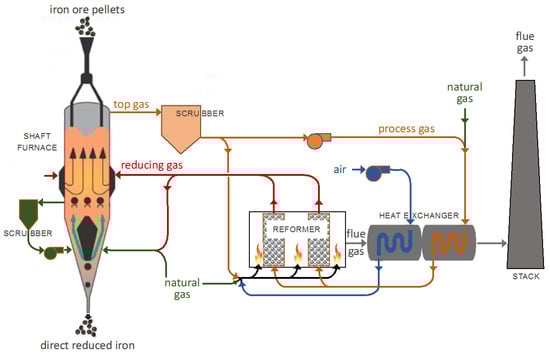- Alhumaizi, K.; Ajbar, A.; Soliman, M. Modelling the complex interactions between reformer and reduction furnace in a midrex-based iron plant. Can. J. Chem. Eng. 2012, 90, 1120–1141. [Google Scholar] [CrossRef]