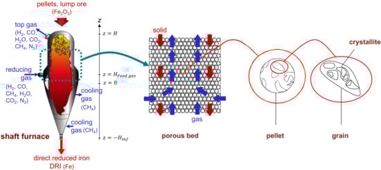 The solid load is fed from the top of the reactor () to form a moving bed of solid particles composed of spherical iron ore pellets that descend by gravity. The pellet diameter (dp) is assumed to be unique and unchanging during the reduction reaction, and the initial pellet composition is known. The gas phase is composed of six species: H2, CO, H2O, CO2, N2, and CH4. The reducing gas is injected from the sidewall, at a height of which then moves upward, against the solid flow, before finally exiting the furnace at the top. The temperature and composition of this reducing gas are known. A secondary feed gas—the cooling gas—which is introduced from the bottom of the furnace (), is also considered. This cooling gas exits the furnace, through the wall in the upper part of the conical section. The temperatures of the solid and gas are different and vary, according to their position (r, z) within the furnace. The solid temperature is assumed to be uniform in the interior of the pellets. Thus, this model is based on a faithful description of the physical-chemical and thermal phenomena, from the reactor scale to the crystallite scale, as shown in Figure 2. In the pellet sub-model, the pellet is assumed to be initially comprised of dense grains; these grains later fragment into smaller crystallites at the wüstite stage, in agreement with microscopic observations [19]. Thus, from the reactor to the crystallites, we have a 4-scale model.