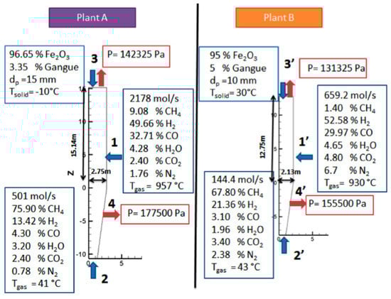 Figure 3 shows the values of the known boundary conditions for the two simulations conducted, corresponding to two different plants. Plant A is a North American, MIDREX plant, currently in operation, the main operating data of which were provided to us. Plant B was the first MIDREX plant operated in the USA, for which published data are available [10]. The production capacity of plant A is 4.5 times greater that of plant B.
