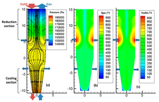 Figure 5b,c show the temperature distribution of the gas and solid phases in the reactor. First, it was found that the gas and solid temperatures were very close to each other. This similarity resulted from the high gas-to-solid heat transfer, as was described in a previous study [14]. Downwards from the solid inlet, the solid temperature rapidly increased to reach the gas temperature. Second, the temperatures were not axially or radially uniform, throughout the reactor. The hottest zone was near the reducing gas inlet, with gas introduced at 957 °C. Above this inlet, the temperature decreased, because of methane reforming (as shown later, in Figure 7), an endothermic reaction. Third, the cooling gas not only cooled the solid in the bottom section but also influenced the temperature field in the reduction section, with the gas rising from the cooling zone to the central part of the reduction zone. This maintained a lower temperature alongside the center of the shaft.