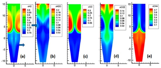 As showcased by Figure 7, the situation here is more complex, due to the numerous reactions occurring. The main features of these reactions are as follows. Near the reducing gas inlet, the reforming of methane occurred, which increased the H2 and CO contents. Above the gas inlet, the H2 and CO contents decreased, while H2O and CO2 were formed, as a result of the reduction reactions. In the central zone, with less reduction, lower amounts of H2O and CO2 were formed, and part of the cooling gas, rich in CH4, was present.