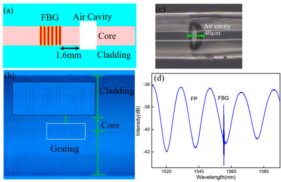 (a) Schematic diagram of the sensor head; (b) Micrograph of the FBG; (c) micrograph of the FP; (d) mixed spectrum of the FBG and the FP cavity.
