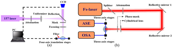 Schematic of the fabrication system. (a) 157 nm laser micromachining system; (b) 800 nm femtosecond laser system.