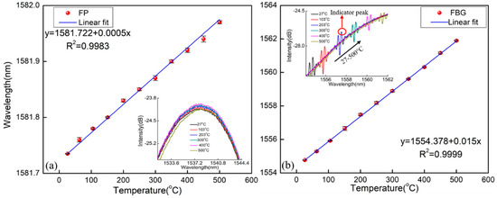 Figure 3a shows the temperature experimental setup. The light from the sweeping laser source in Si720 was launched into the sensor head using a circulator. The optical spectrum analyzer (OSA) (Si720, Micron Optics, Atlanta, GA, USA) was used to monitor the reflection spectrum with a wavelength resolution of 2.5 pm and a wavelength scanning range of 1510~1590 nm. The temperature characteristic of the sensor was demonstrated from room temperature to 500 °C with a temperature interval of 50 °C, which was placed in a high temperature tube furnace with a temperature accuracy of ±1 °C (Lenton, Derbyshire, UK). The temperature of the furnace was kept constant for 20 min at each step to ensure uniform distribution of the temperature before each recording. The experiment was then repeated for three cycles to verify the repeatability of the sensor. The wavelengths of the FP and FBG were plotted as a function of the temperature, as shown in Figure 4. It is seen that the resonance wavelength has a red shift with the rising temperature and the temperature response has good repeatability. The temperature sensitivities of the FP and the FBG were 0.5 pm/°C and 15 pm/°C, respectively. In the insets of Figure 4, the reflection spectra of the sensor at different temperatures are plotted. The sensor has a good spectral profile at high temperatures and the FBG has two reflection peaks, in which the reflection peak at a long wavelength was the indicator peak and the peak at a short wavelength was the side lobe.