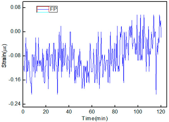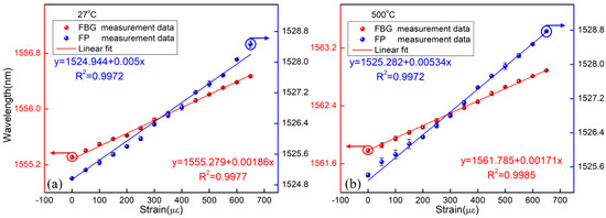 The strain responses of the FBG and FP cavity were tested at different temperatures, respectively. The sensor was placed in a tube furnace, and the experimental setup is shown in Figure 3a. Additionally, both sides were fixed on two one-dimensional stages with a displacement resolution of 0.01 mm. At each temperature point, the applied strains on the device were increased from 0 to 650 µε and then decreased down to 0 µε in steps of 50 µε. The applied strain was held for 10 min to achieve stable readings of the wavelengths at each step. Then, the experiment was conducted for three cycles to verify the repeatability of the sensor. During the whole tests, we recorded the two resonance wavelengths of the FBG and the FP, respectively. Figure 5 shows the resonance wavelength shift with the strain rising at two different temperatures. From this figure, it is seen that the strain sensitivities of the FP and the FBG were 5.0 pm/µε and 1.86 pm/µε at 27 °C, respectively. Simultaneously, the strain sensitivities of the FP and the FBG were 5.34 pm/µε and 1.71 pm/µε at 500 °C, respectively. Hence, the temperature and strain change could be obtained based on Equation (3) and Equation (4), respectively. For clarity, the strain sensitivities of the sensor at different temperatures are given in Table 1. It shows that the strain coefficients of the device were slightly different under different temperatures, which may result from the change of the properties of the silica material induced by heating. For the FP, the changes in the refractive index of the air in the FP cavity caused by the temperature also affected the strain sensitivity. Furthermore, at room temperature and standard atmospheric pressure, the strain stability of the FP sensor was obtained within 2 h when the sensor was fixed on the optical experimental platform, as shown in Figure 6. It was found that the fluctuation of the FP strain sensor was ±0.21 µε. This is mainly caused by the fluctuation of the light source and destabilization of the environment (temperature, vibration).