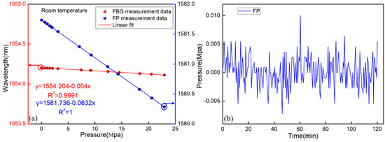 The pressure characteristics of the FP and FBG were investigated at room temperature, respectively. The device was sealed in a metal tunnel. A pressure generator-controller was used to provide and control the pressure to the sensor. The calibration of the pressure applied to the sensor was achieved by the pressure meter with an accuracy of 0.05%, as shown in Figure 3b. The pressure was increased from 0 to 23 Mpa and then decreased down to 0 Mpa at an unequal interval. This process was carried out three times to verify the repeatability of the sensor. Additionally, the relationships between the wavelength and pressure are shown in Figure 7a. It is found that the pressure sensitivities of the FP and the FBG were −63.2 pm/MPa and −4 pm/MPa, respectively. The temperature and pressure variations could be obtained based on Equation (7) and Equation (8), respectively. The pressure stability of the FP was also tested within 2 h, as given by Figure 7b. It is found that the fluctuation of the FP pressure sensor was ±0.01 MPa. Similarly, it is mainly caused by the fluctuation of the light source and destabilization of the environment (temperature, vibration).