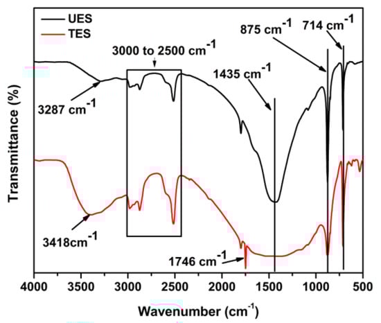 The chemical structure before and after treatment of ES particles was examined by FTIR analysis as depicted in Figure 1. It can be seen that UES particles represent characteristic peaks at 1435, 875, and 714 cm−1, representing the asymmetric stretch, out-of-plane bend and in-plane bending vibrations of CO32− ion, respectively [29,30]. The absorption bands situated in between 3000 to 2500 cm−1 were identified as organic matter and a broad absorption band at 3287 cm−1 was due to the stretching vibration of structural H2O [31]. The peak positioned at 2505 cm−1 can be assigned to acidic hydrogen group –OH stretching [32]. The carbonyl (C=O) stretching vibrations of SA can be observed in the range of 1800 to 1700 cm−1. After treatment with SA, it is evident that asymmetric stretch peak of CO32− almost vanishes and out-of-plane bend CO32− decreases in intensity to a greater extent, indicating CO32− on the surface of UES particles react with SA. A clear peak is also observed at 1746 cm−1 for C=O stretching in TES which is absent in UES particles, representing the presence of SA ion RCOO―. On the other hand, the stretch vibration of structural water of UES was broadened and shifted from 3287 cm−1 to 3418 cm−1 in TES; which shows a considerable change of structural water in TES particles. The peak of acidic hydrogen group (–OH) stretching also increases in TES which can be attributed to chemical reaction of SA with ES particles. Based on these observations, the proposed reaction is shown in Scheme 1.