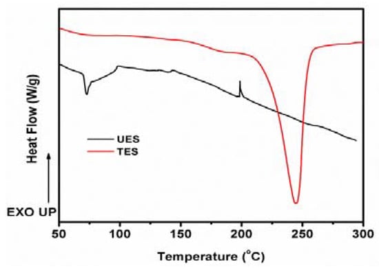 The DSC was employed for the detection of phase transformation of ES particles on heating; plots are produced as Figure 3. For UES particles, few peaks around 60 to 150 °C were detected; these can be related to free water and bio-impurities degradation. For TES particles, an obvious endothermic peak was detected at 240 °C. The endothermic reactions occurred due to volatilization of the molecules, whereas exothermic reaction occurred due to the formation of charring (solid residue) [35,36]. From this analysis, it can be apparent that the surface of TES was modified by chemical bonding of SA to the UES surface to a greater extent.