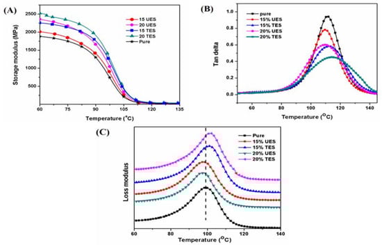 The tan δ plot of pure epoxy, UES and TES particles filled epoxy composites with respect to temperature are shown in Figure 8B. The neat epoxy showed increased tan δ height value as compared to UES and TES particles filled composites; this represents the weak interfaces and frictional damping behavior. The deformation energy is dissolute mostly at the interface of composite materials. If the particle amount, geometry and matrix are identical, the tan δ value can be used to study the interfacial properties of composites. The higher tan δ height means the composite has a tendency to dissipate more energy—i.e., poor interfacial adhesion results in higher damping values. Moreover, the broadening of tan δ is related to molecular relaxations at the interfacial region. The introduction of ES particles reduces the height and increase the broadening of tan δ values, the composite showed increase of molecular interaction and relaxations at the interfacial regions. The smallest and broadening damping curves were observed for TES particles filled composites as compared to the UES particles filled composites [43]. This confirmed that TES particles filled composites have higher load bearing capacity than the UES particles filled composites. Moreover, a positive shift in loss modulus values to higher temperature of TES filled composites composite also represents more energy retention in contrast to UES filled composites and pure epoxy as shown in Figure 8C, which is in consistent with the tan δ results.