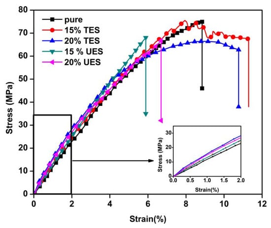 Tensile stress–strain curve of UES and TES filled epoxy composites on various compositions.