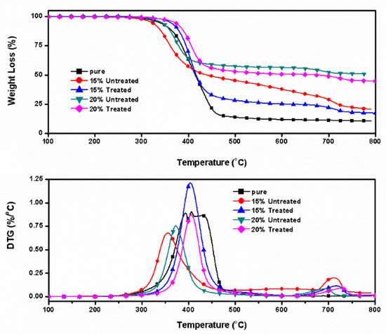 The initial degradation temperature (values of T5%, T10%, and T20%) for 15 wt % UES particles containing epoxy composites were much lower than the neat matrix; however, the 20 wt % UES particles epoxy composites showed a slightly higher values, which may be due to the improved cross links formed between proteins and epoxy as discussed in DMA section. These results are much different than the reported literature due to the alkyl structure attached on the TES particles [18]. The UES particles only increases the char yield values for the composites which were much higher than the neat matrix. However, the TES particles also increase the thermal stability of composites. The TES particles filled epoxy composites also showed the improved initial degradation temperature as the loading of TES particles increased. The DTG peak values for the TES/epoxy composites were moved to higher temperature.