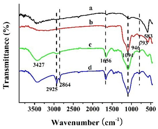 FTIR spectroscopy was used to elaborate the functional groups of Fe3O4@CTS/SiO2-C12 composite, as shown in Figure 1. The typical absorption peak for Fe3O4 nanoparticles (Figure 1a) at 583 cm−1 was attributed to Fe–O stretching vibration [20]. This band can be also observed in the FTIR spectrums of other magnetic composites. The stretching vibrations of N–H bonds at 3427 cm−1 and amide band I at 1656 cm−1 from chitosan were both appeared in the spectrums of Fe3O4@CTS/SiO2 composite (Figure 1c) and Fe3O4@CTS/SiO2-C12 composite (Figure 1d). The presence of bands centered at 793 and 1094 cm−1 were most probably due to Si–O vibration, which confirmed the presence of a siliceous network in the composite [23]. Moreover, the intensity of the peaks at 2925 and 2864 cm−1 that belonged to the stretching vibrations of C–H bond were obviously increased in the spectrum of Fe3O4@CTS/SiO2-C12 composite. The results indicate that dodecyl group has been bonded successfully with Fe3O4@CTS/SiO2 composite.