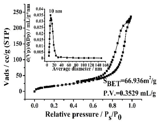 The porosity of Fe3O4@CTS/SiO2-C12 composite was investigated by nitrogen adsorption-desorption measurements. As shown in Figure 2, the adsorption-desorption isotherms of the resulting composite belonged to type IV isotherm and the type of hysteresis loop might be classified as type H2 [32]. The pore size can be found to be mainly distributed around 10.0 nm. The surface area (SBET) and total pore volume (P.V.) of Fe3O4@CTS/SiO2-C12 composite at the optimal synthesis conditions was calculated to be 66.9 m2/g and 0.353 mL/g, respectively.